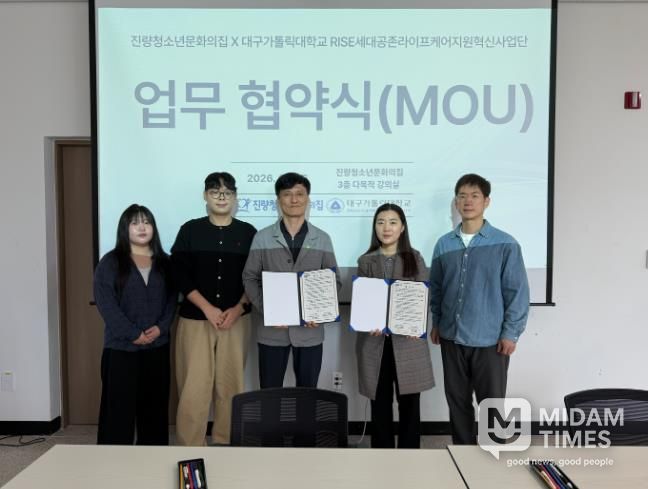미담타임스 김준완 기자 | 진량청소년문화의집은 지역 청소년들에게 심리, 상담, 활동 등 다양한 경험을 지원하기 위하여 16일 대구가톨릭대학교 RISE 세대공존 라이프케어 지원혁신사업단과 업무협약을 체결했다.