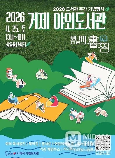 미담타임스 황명수 기자 | 거제시 시립도서관은 4월 도서관 주간을 맞아 오는 4월 25일 상동동 용산쉼터에서 시민 참여형 야외 독서문화 행사인 2026 거제 야외도서관 『봄날의 書(서)핑』을 개최한다.
