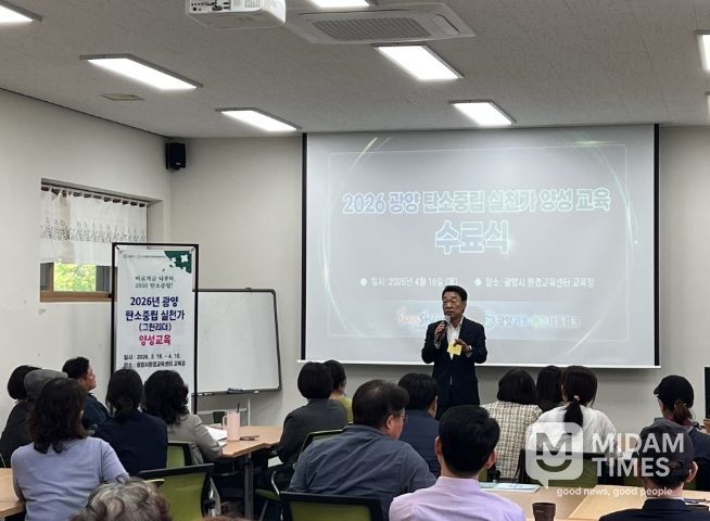 미담타임스 김준완 기자 | 광양시와 (사)광양기후·환경네트워크는 4월 16일 광양시 환경교육센터에서 ‘2026년 탄소중립 실천가 양성교육’ 수료식을 열고 41명의 새로운 탄소중립 실천가를 배출했다고 밝혔다.