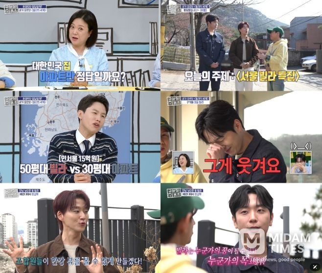 이날 방송은 서울 곳곳의 ‘빌라’를 임장하는 ‘빌라의 모든 것’ 특집으로 꾸며졌다. 한국에서 통상적으로 다세대·다가구·연립주택 등 저층 공동주택을 일컫는 ‘빌라’를 중심으로 다양한 매물들이 소개된 가운데, 4월 컴백을 앞둔 포레스텔라 조민규와 고우림이 게스트로 출연해 MC 양세형과 호흡을 맞췄다. 특히 평창동 자취 경험이 있는 부동산 관심러 조민규와 ‘홈즈’에 출연했던 임장 선배 고우림, 그리고 양세형의 케미가 색다른 재미를 더했다.