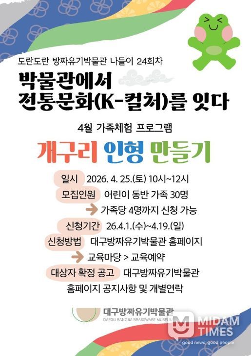 미담타임스 전해찬 기자 | 대구문화예술진흥원 박물관운영본부 소속 대구방짜유기박물관은 화창한 봄날 4월에 전통공예 가족체험과 팔공산 역사문화 이해 특강을 기획하여, 4월 25일 오전 10시에 ‘개구리 인형 만들기’ 체험을, 4월 28일 오후 2시에 ‘고려 태조 왕건 후백제 견훤과 팔공산’ 강의를 개최한다.