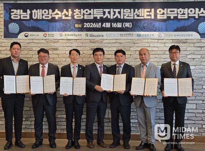 미담타임스 황명수 기자 | 경상국립대학교 해양과학대학은 경상남도 해양수산 창업투자 활성화를 위해 4월 16일 경남테크노파그에서 경상남도, 경남테크노파크, 경남항노화연구원, 수협중앙회 경남본부, 경상남도 청년어업인연합회 등과 업무협약(MOU)을 체결했다.