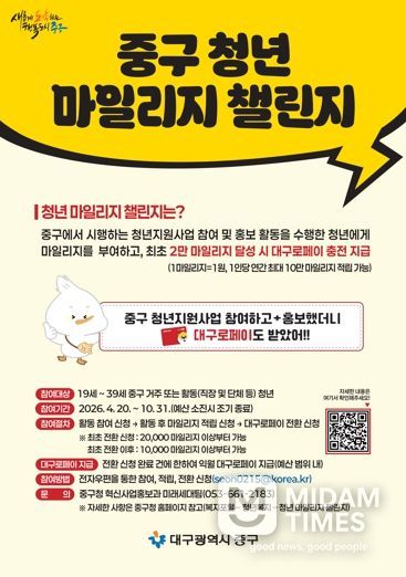 미담타임스 전해찬 기자 | 대구 중구는 청년들의 청년지원사업 참여를 확대하고 정책 인지도와 체감도를 높이기 위해 ‘청년 마일리지 챌린지’를 4월 20일부터 10월 31일까지 시행한다.