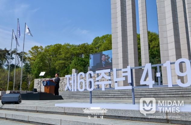 미담타임스 공한별 기자 | 이재명 대통령과 김혜경 여사는 19일 오전 10시, 서울특별시 강북구에 위치한 국립4·19민주묘지에서 거행된 ‘제66주년 4‧19혁명 기념식’에 참석해 66년 전 이 땅의 민주주의를 수호하기 위해 불의에 항거한 시민과 학생들의 정신을 기억하고, 희생자 유족 등을 위로하는 시간을 가졌다.