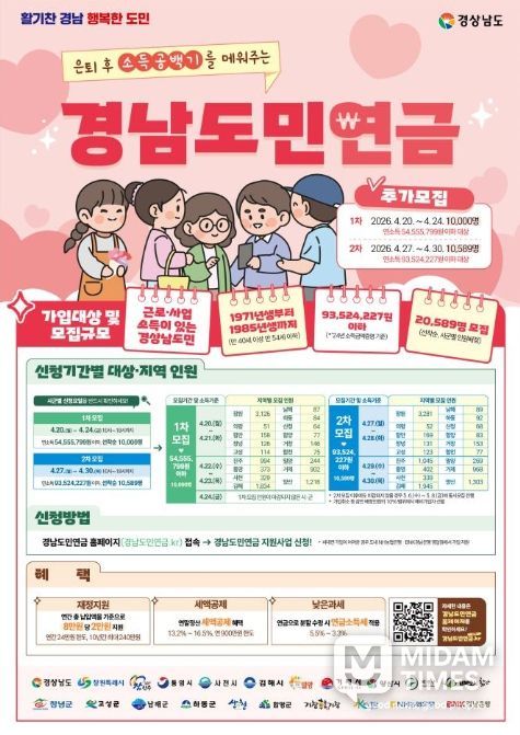 미담타임스 황명수 기자 | 경상남도는 도민의 소득 공백기 해소와 안정적인 노후 준비를 지원하기 위한 ‘경남도민연금 가입자 추가 모집’을 4월 20일 오전 10시부터 시작한다.
