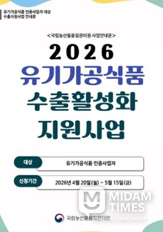 미담타임스 김준완 기자 | 국립농산물품질관리원은 국내 유기가공식품의 해외 시장 진출을 돕기 위해 20일부터 ‘2026년 유기가공식품 수출 활성화 지원사업’을 추진한다고 밝혔다. 해외 시장 진출에 어려움을 겪는 유기가공식품 인증사업자들에게 수출 준비부터 해외 구매자 연결까지, 맞춤형 지원을 제공해 판로 확대에 기여할 것으로 기대된다.