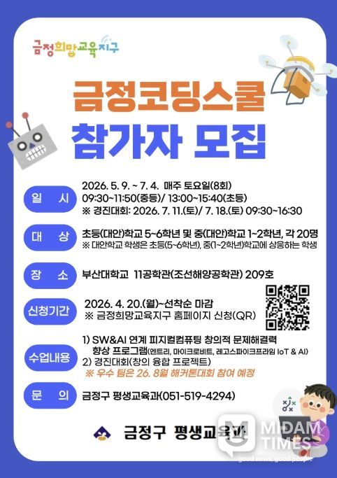 미담타임스 남혜영 기자 | 부산 금정구는 초‧중학생을 대상으로 인공지능(AI) 및 소프트웨어(SW) 교육 프로그램인 녪금정 코딩스쿨’을 운영한다고 밝혔다.