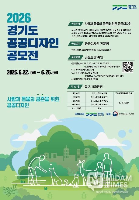 미담타임스 정주환 기자 | 경기도가 ‘사람과 동물의 공존을 위한 공공디자인’이란 주제로 제20회 ‘2026년 경기도 공공디자인 공모전’을 6월 22일부터 26일까지 개최한다.