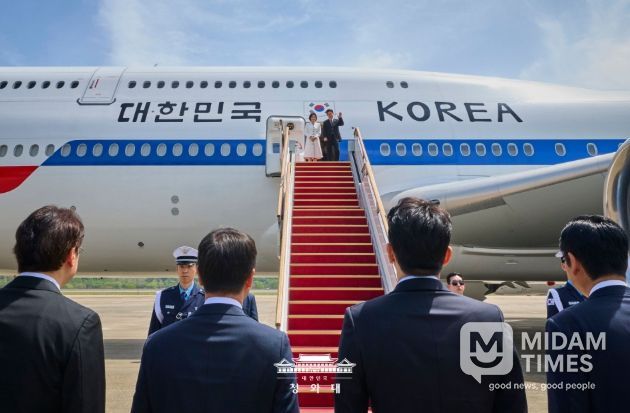 미담타임스 공한별 기자 | 이재명 대통령과 김혜경 여사는 5박 6일 일정의 인도 및 베트남 국빈 방문을 위해 19일 경기 성남 서울공항에서 대통령 전용기(공군 1호기)를 이용해 출국했다.