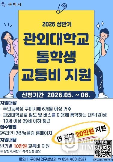 미담타임스 김준완 기자 | 구미시가 관외 대학(원)생의 통학 부담을 줄이기 위해 교통비 지원 방식을 대폭 손질했다. 실비 정산을 폐지하고 연 최대 20만원 정액 지원으로 전환하는 한편, 증빙 절차를 간소화해 청년 체감도를 높인 것이 핵심이다.