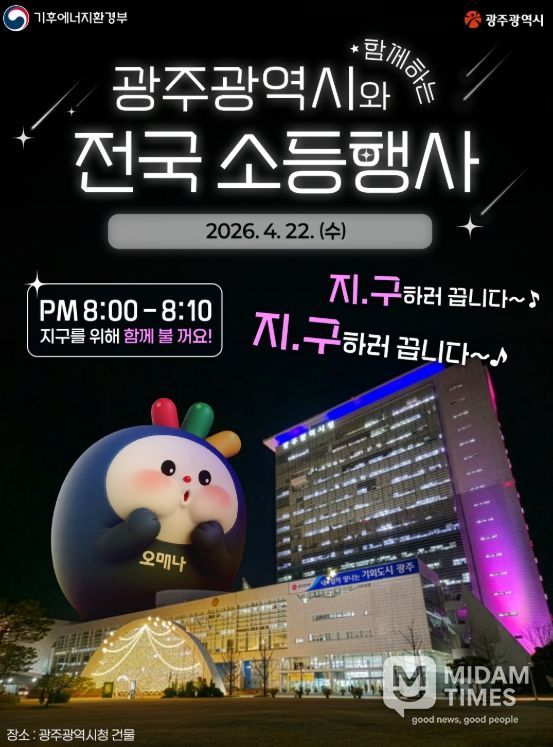 미담타임스 김준완 기자 | 광주광역시는 ‘지구의 날’인 22일 밤 8시부터 10분동안 전등을 끄는 ‘지구의 날 소등 행사’를 실시한다.