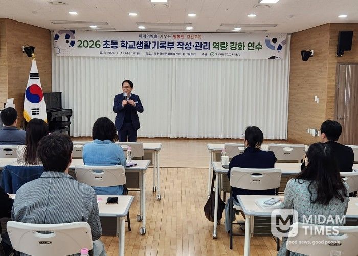 미담타임스 김준완 기자 | 경상북도김천교육지원청은 2026년 4월 15일(수) 김천학생문화예술센터에서 관내 초등학교 학교생활기록부 업무담당자 및 희망 교사 30명을 대상으로 '2026 초등 학교생활기록부 작성・관리 역량 강화 연수'를 실시했다.