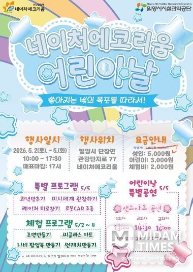 미담타임스 황명수 기자 | 밀양시시설관리공단(이사장 김경민)은 오는 5월 2일부터 5일까지 어린이날을 맞아 선샤인 밀양 테마파크 내 네이처에코리움에서 가족 단위 방문객을 위한 ‘제3회 네이처에코리움 어린이날 행사’를 개최한다.
