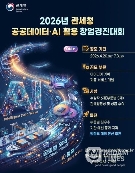 미담타임스 공한별 기자 | 관세청은 공공데이터로 개방된 관세무역데이터에 인공지능 기술을 활용한 혁신적인 창업아이디어를 발굴·지원하기 위해 4월 20일부터 '2026년 관세청 공공데이터·인공지능(AI) 활용 창업경진대회'를 개최한다.