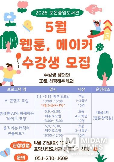 미담타임스 김준완 기자 | 포항시립포은중앙도서관은 오는 21일 오전 10시부터 ‘2026년 5월 웹툰·메이커 프로그램’ 수강생을 선착순 모집한다.