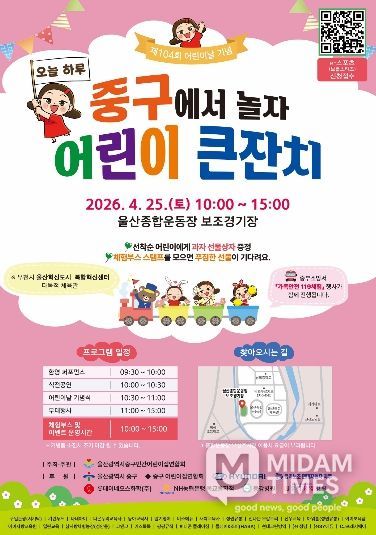 미담타임스 김준완 기자 | 제104회 어린이날을 기념해 ‘2026년 종갓집 중구 어린이 큰잔치’ 행사가 오는 4월 25일 오전 10시부터 오후 3시까지 울산종합운동장 보조경기장에서 열린다.