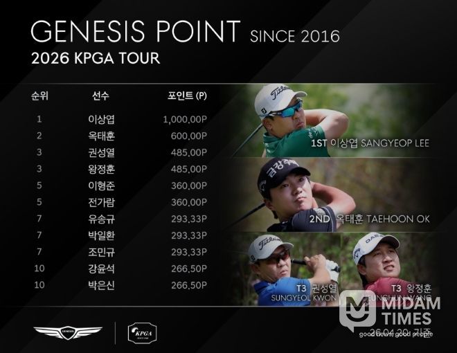 권성열(40)과 왕정훈(31.DAEJIN)이 485포인트로 제네시스 포인트 3위, 이형준(34.웰컴저축은행), 전가람(31.LS)이 360포인트로 제네시스 포인트 5위에 이름을 올렸다.