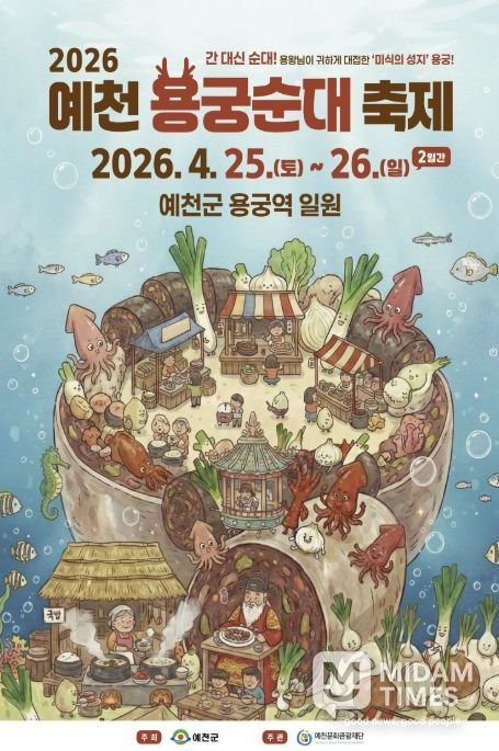 미담타임스 김준완 기자 | 예천군의 대표 향토 먹거리 축제인 '2026 예천 용궁순대축제'가 오는 4월 25일부터 26일까지 이틀간 용궁역 일원에서 화려하게 펼쳐진다.