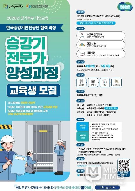 미담타임스 정주환 기자 | 경기도일자리재단은 승강기 전문 인력 양성을 통해 일자리 문제 해결과 지역경제 활성화를 추진하고자 ‘2026년 승강기 전문가 양성 과정’ 교육생을 모집한다고 21일 밝혔다.
