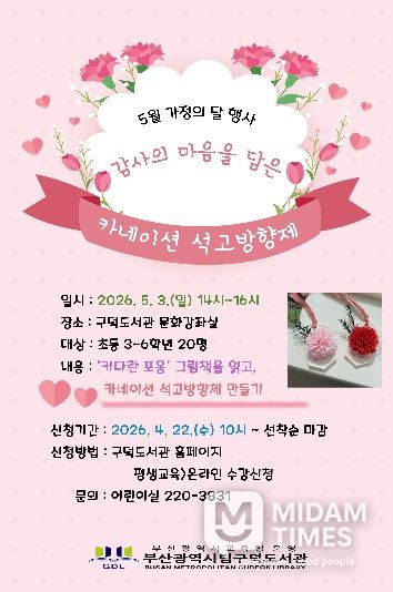 미담타임스 남혜영 기자 | 부산광역시립구덕도서관은 다음달 3일 도서관 문화강좌실에서 초등학교 3~6학년 20명을 대상으로 ‘감사의 마음을 담은 카네이션 석고방향제’ 체험을 운영한다.