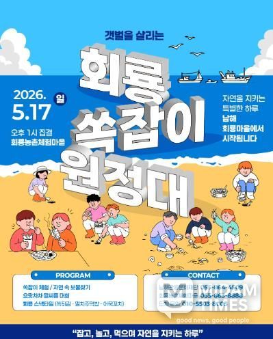 미담타임스 황명수 기자 | 남해관광문화재단은 ‘2026 지역민 주도 소규모 축제 개최 지원 사업’의 일환으로 오는 5월 17일 일요일 오후 1시 ‘갯벌을 살리는 회룡 쏙잡이 원정대’ 축제를 개최한다.