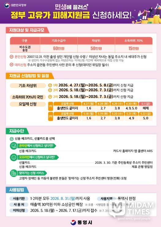 미담타임스 황명수 기자 | 통영시는 최근 중동 분쟁에 따른 국제 유가 급등과 지속되는 고물가로 어려움을 겪는 시민들의 가계 부담을 덜기 위해 ‘고유가 피해지원금’과 ‘경남도민 생활지원금’지급을 위한 준비를 차질 없이 진행하고 있다고 21일 밝혔다.