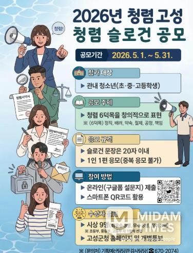 미담타임스 황명수 기자 | 고성군은 관내 초·중·고등학생을 대상으로 「2026년 고성군 청렴 슬로건 공모전」을 오는 5월 말까지 실시한다.