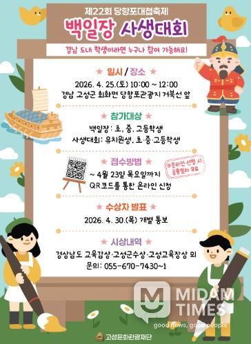 미담타임스 황명수 기자 | 고성문화관광재단은 '제22회 당항포대첩축제' 기간 중 청소년과 가족이 함께 참여할 수 있는 체험형 역사교육 프로그램으로, 4월 25일 오전 10시 ‘경남학생 백일장·사생대회’와 오후 1시 ‘최태성과 함께하는 당항포대첩 – 두 번째 이야기’를 운영한다.