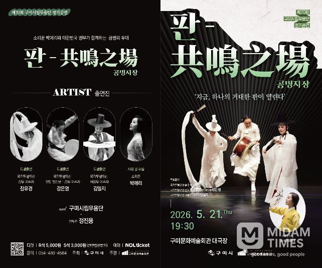 미담타임스 김준완 기자 | 구미시는 5월 21일 오후 7시 30분, 구미시문화예술회관 대공연장에서 ‘제70회 구미시립무용단 정기공연 '판-共鳴之場공명지장'’을 개최한다.