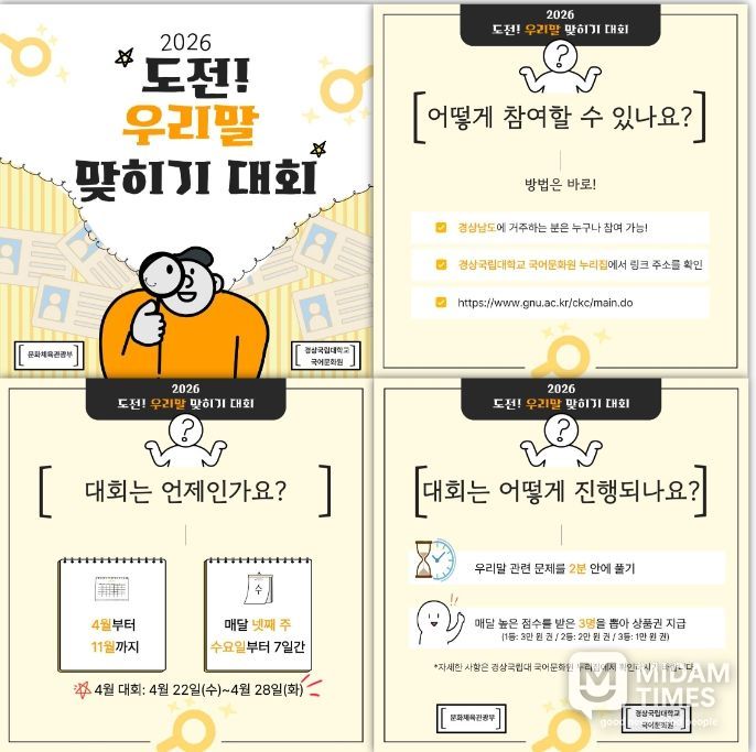 미담타임스 황명수 기자 | 경상국립대학교국어문화원(원장 박용식 국어국문학과 교수)은 경상남도민을 대상으로 ‘2026 도전! 우리말 맞히기 대회’를 개최한다.