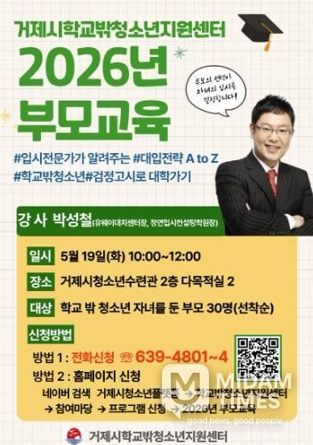 미담타임스 황명수 기자 | 거제시학교밖청소년지원센터에서는 5월 19일 학교 밖 청소년 자녀를 둔 부모를 대상으로'2026년 학교 밖 청소년 부모교육'을 실시한다고 밝혔다.