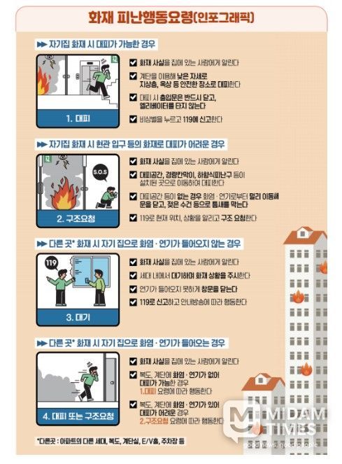 미담타임스 공한별 기자 | 소방청은 최근 아파트 화재가 잇따라 발생함에 따라, 인명피해를 최소화하기 위해 무리한 대피보다는 화재 상황을 먼저 판단하고 행동하는 상황별 피난 행동요령을 철저히 준수해 줄 것을 당부한다고 17일 밝혔다.