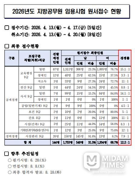 미담타임스 남혜영 기자 | 부산광역시교육청은 지난 13일부터 17일까지 실시한 ‘2026년도 지방공무원 임용시험’ 원서접수 결과 144명 선발에 1,753명이 지원해 평균 12.2대 1의 경쟁률을 보였다고 밝혔다.