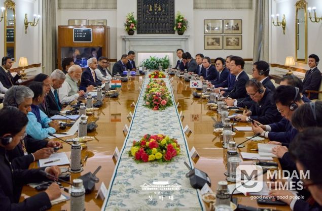 이 대통령은 인도의 인구와 GDP 규모에 비해 우리 교민 수는 1만 2000명, 우리 진출 기업 수는 670여 개 정도로 한-인도 관계가 정체돼 있다면서, 이번 회담을 통해 민간 교류, 경제 협력, 안보 협력 등 지금과는 차원이 다른 협력을 해 나가자고 했다.