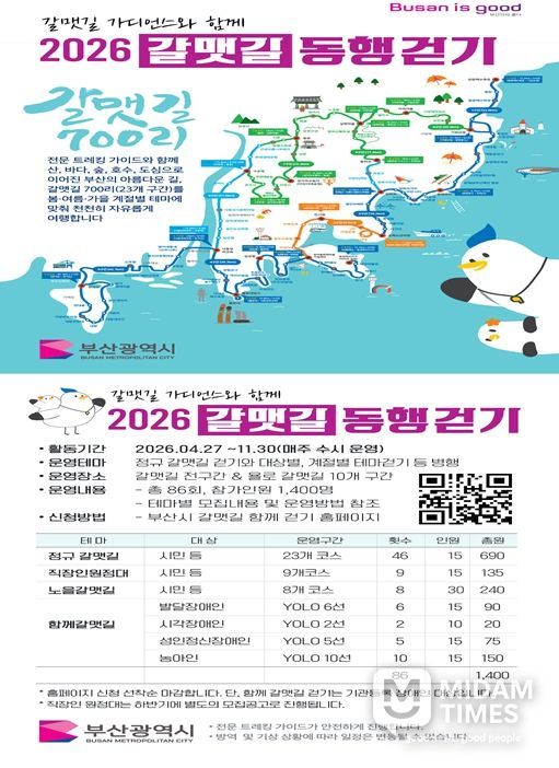 미담타임스 남혜영 기자 | 부산시는 오는 4월 27일부터 11월 30일까지 약 8개월간 '2026년 갈맷길 동행 걷기 행사'를 운영한다고 밝혔다.