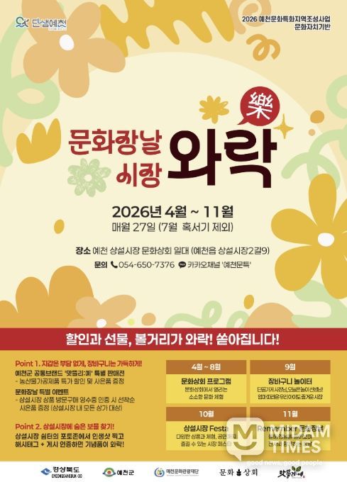 미담타임스 김준완 기자 | (재)예천문화관광재단은 오는 4월 27일부터 11월까지 매달 27일, 예천 장날에 예천읍 상설시장 일대에서 ‘문화장날 시장와~락(樂)’을 개최한다.