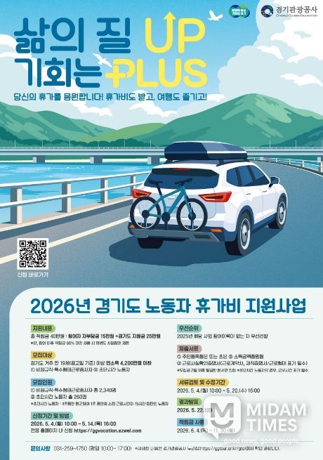 미담타임스 정주환 기자 | 경기도가 경제적 부담으로 휴식을 포기했던 비정규직과 특수형태근로종사자에게 휴가비를 지원하는 ‘취약노동자 휴가비 지원사업’ 참여자를 5월 4일부터 14일까지 모집한다.