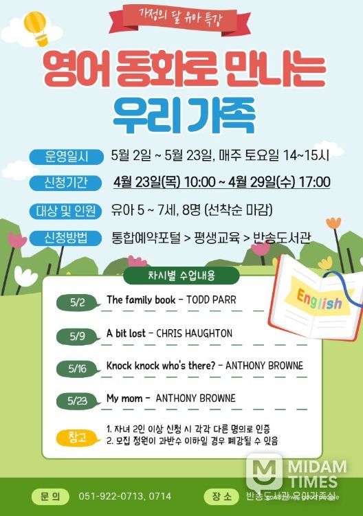 미담타임스 남혜영 기자 | 부산광역시립반송도서관은 다음달 2일부터 23일까지 매주 토요일마다 도서관 유아가족실에서 5~7세 유아 8명을 대상으로 가정의 달 유아 특강 ‘영어 동화로 만나는 우리 가족’을 운영한다.