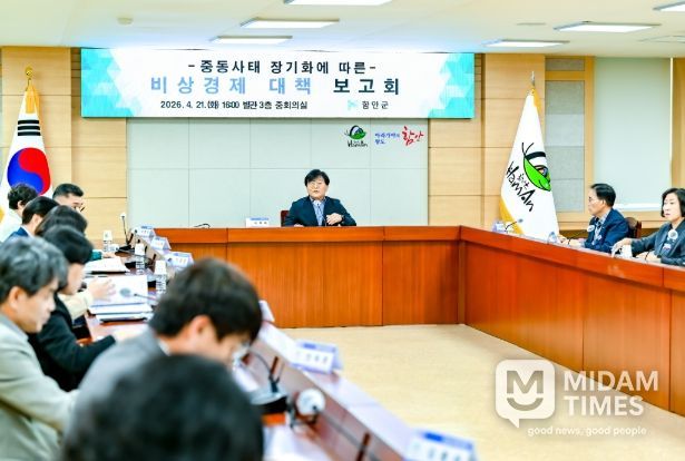 미담타임스 황명수 기자 | 함안군은 중동전쟁 장기화에 따른 고유가와 원자재 수급 불안에 대응하기 위해 지난 21일 군청 중회의실에서 ‘비상경제 대책 보고회’를 개최하고 전방위 비상경제 대응체계를 가동했다고 밝혔다.