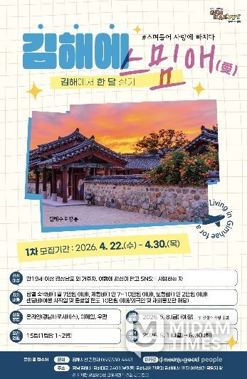 미담타임스 황명수 기자 | 김해시는 머무르는 여행지로 도약하기 위해 김해 한 달 여행 프로그램 ‘김해에 스밈애(愛)’ 1차 참가자를 모집한다고 22일 밝혔다.