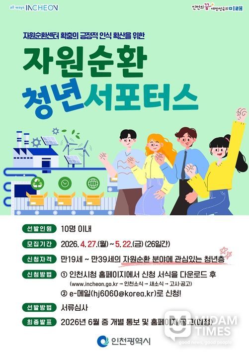인천시는 자원순환센터 확충에 대한 긍정적 인식을 확산시키고, 실질적인 정책 아이디어를 발굴하기 위해 4월 27일부터 5월 22일까지‘2026 자원순환 청년 서포터스’를 공개 모집한다고 밝혔다.