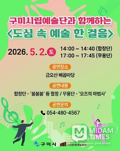 미담타임스 김준완 기자 | 구미시는 가정의 달을 맞아 5월 2일 금오산 배꼽마당에서 구미시립예술단과 함께하는 야외공연 '도심 속 예술 한 걸음'을 개최한다.