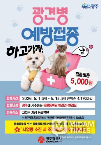 미담타임스 김준완 기자 | 광주광역시는 반려동물과 시민의 건강을 지키기 위해 5월 1일부터 15일까지 ‘봄철 광견병 예방접종 사업’을 추진한다.