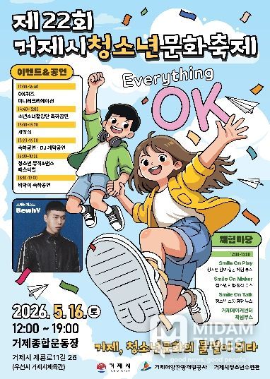 미담타임스 황명수 기자 | 거제시는 오는 2026년 5월 16일 12:00~19:00, 거제종합운동장(우천 시 거제시체육관)에서 제22회 거제시청소년문화축제 “Everything OK”를 개최한다.