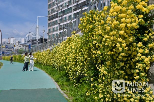 4월 중순부터 꽃망울을 터뜨리기 시작한 목향장미는 4월 말에서 5월 초 만개할 예정으로, 노란 장미들이 하천변 벽면을 뒤덮어 노란빛 플라워 커튼을 드리운 듯한 특별한 풍경을 선사한다.