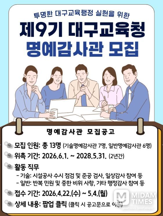 미담타임스 전해찬 기자 | 대구시교육청은 시민 참여를 통해 감사의 공정성과 투명성을 높이기 위해 ‘제9기 명예감사관’ 13명을 공개 모집한다고 밝혔다.