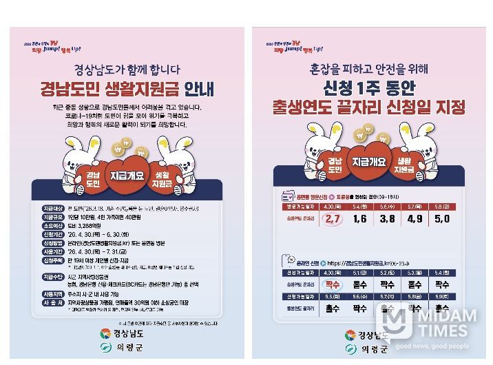미담타임스 황명수 기자 | 의령군은 전 도민을 대상으로 하는 ‘경남도민 생활지원금’을 오는 4월 30일부터 지급한다고 밝혔다.