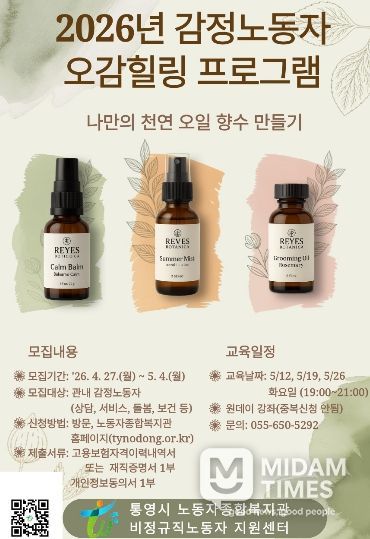 미담타임스 황명수 기자 | 통영시는 관내 서비스업, 돌봄, 보건, 상담 등 다양한 직군의 감정노동자들의 마음 치유와 휴식에 초점을 맞춰 ‘2026년 감정노동자 오감힐링 프로그램’을 통영시노동자종합복지관에서 운영한다고 22일 밝혔다.