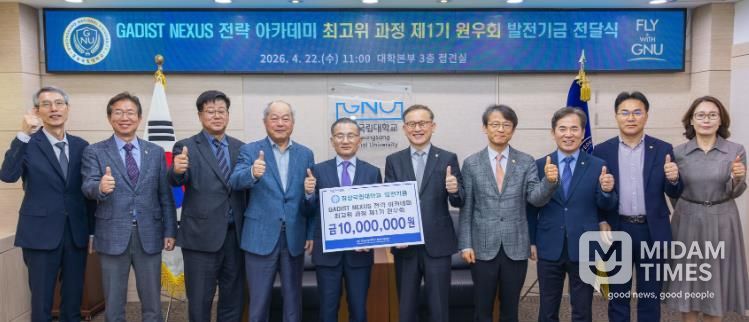 미담타임스 황명수 기자 | 경상국립대학교는 4월 22일 오전 11시 대학본부 3층 접견실에서 ‘GADIST NEXUS 전략 아카데미 최고위 과정’ 제1기 원우회의 대학발전기금 전달식을 개최했다.