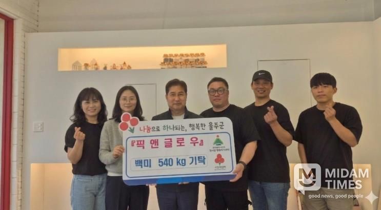미담타임스 김준완 기자 | 울주군 범서읍 구영리에 위치한 ‘픽앤글로우’가 22일 범서읍 행정복지센터에 지역 내 어려운 이웃을 위한 백미 540㎏을 전달했다.